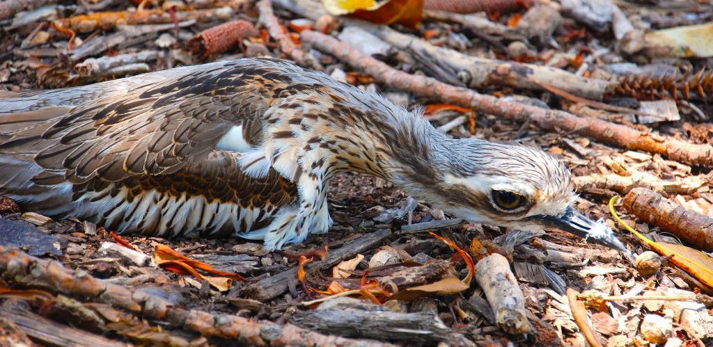 Nests are nothing fancy for the sensible Bush Stone-curlew, just a scratched-up hole in the dirt, strewn with leaf litter, dead grasses, and sticks. “It’s not much, but it’s home.”