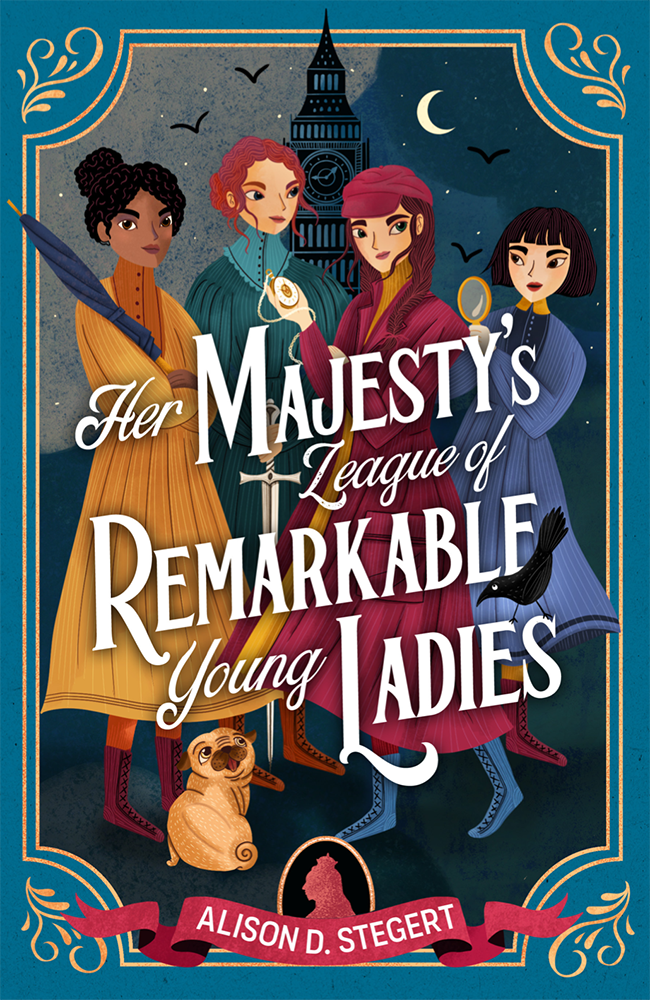 With such a long title, I knew typography would feature, but wow! The fonts and layout of the words suit the story perfectly. The cover hints at several key elements of the book: the London setting, Queen Victoria Herself, eighty percent of the League of young lady spies, the customized tools of espionage, the troublesome Royal Pug, and the mysterious lone magpie.