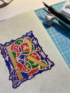 This epiphany prompted me to: a) graduate myself to gold leaf (YAY!), which is a whole new level of challenge and expense, and b) order my own stash of nice parchment, the expensive stuff mainly due to the exorbitant cost of postage to Australia (Sigh…). One day, when my work merits it,Ā I may try real vellum – stretched and scraped animal hide. For now (if ever), my work isn’t worthy of the sacrifice of an animal.