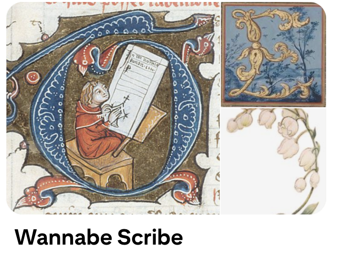 Most of the twenty-six letter designs for the Illuminated Lettering Challenge came from original historical works I found on Pinterest. My illumination board, Wannabe Scribe, is an enormous, ever-growing catalogue of inspiration.